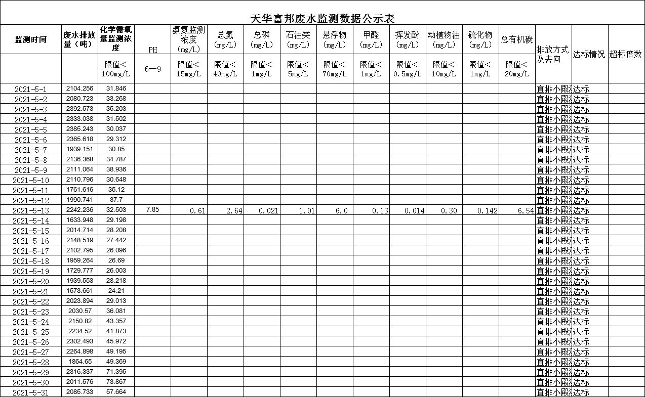 四川天華富邦化工有限責任公司5月廢水監(jiān)測數(shù)據(jù)公示