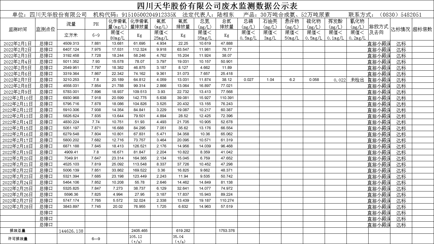 四川天華股份有限公司2022年2月廢水監(jiān)測(cè)數(shù)據(jù)公示