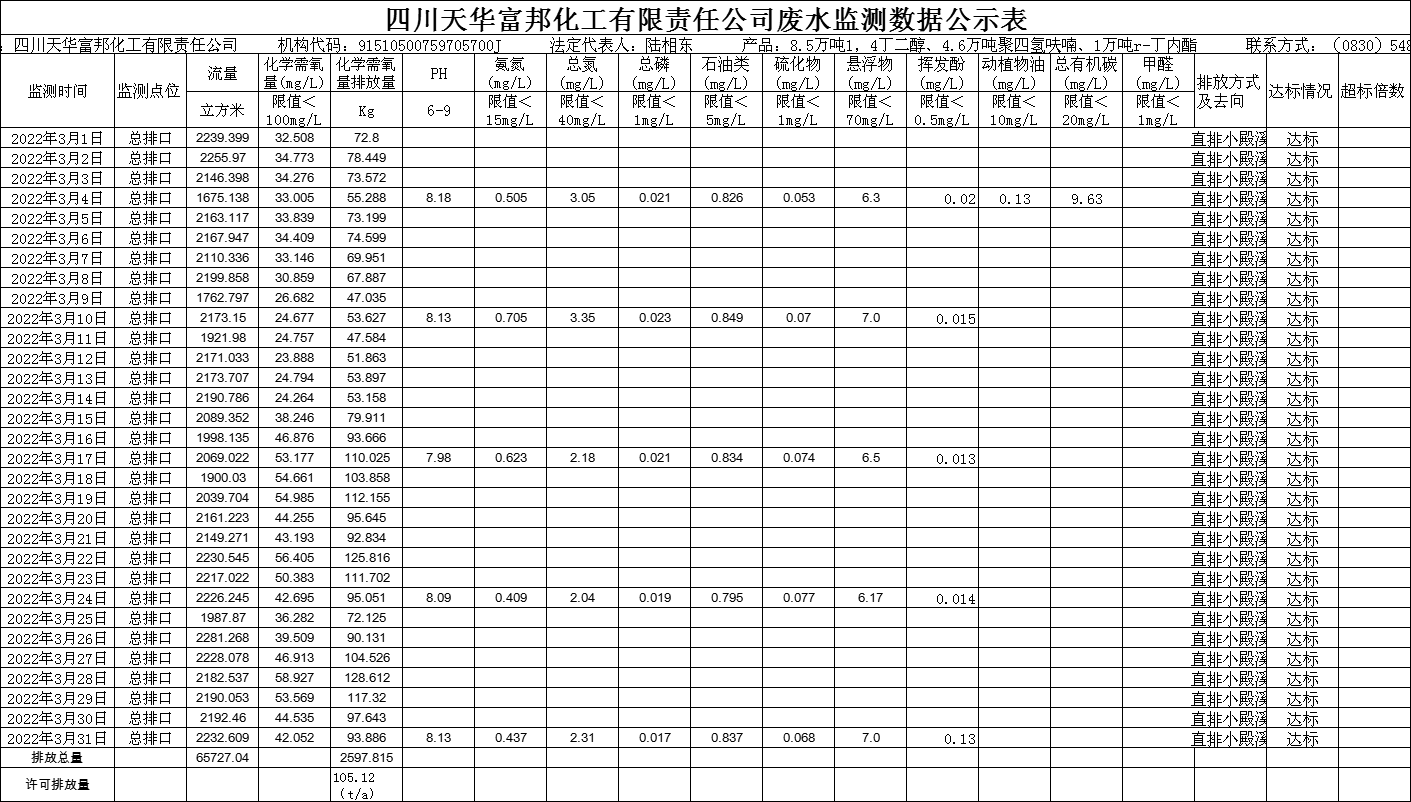 四川天華富邦化工有限責(zé)任公司2022年3月廢水監(jiān)測(cè)數(shù)據(jù)公示