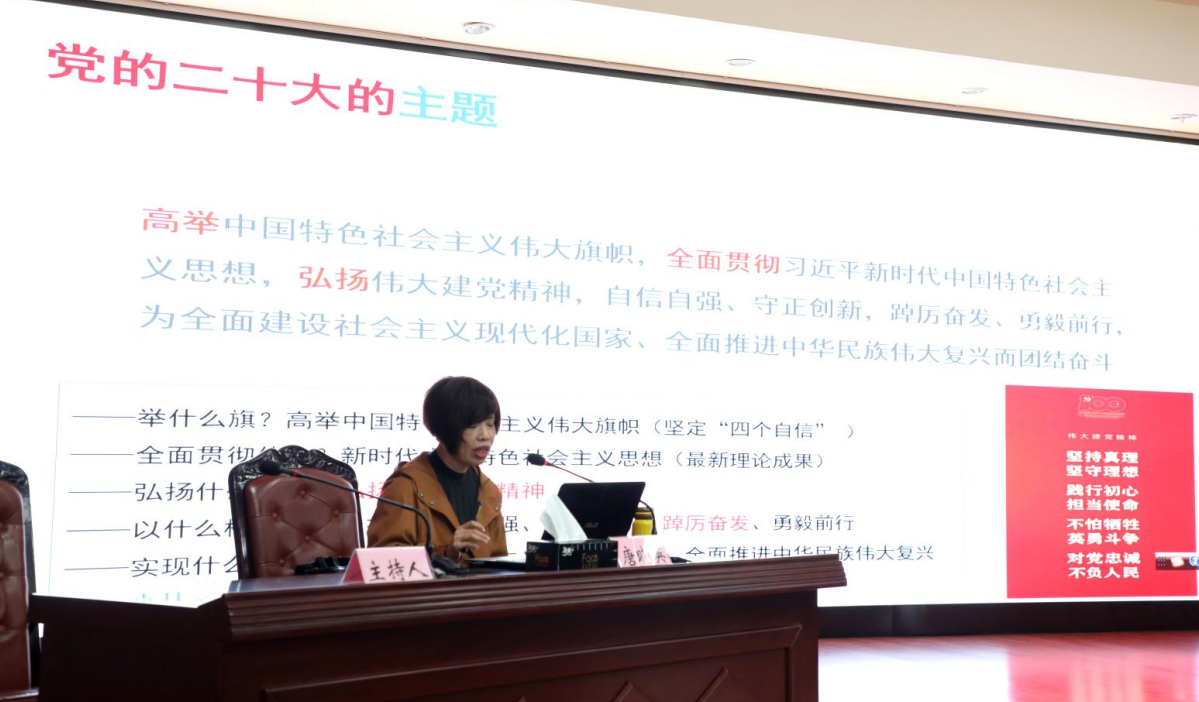 唐曉英從深刻把握黨的二十大的主題和主要成果、深刻把握過去5年的工作和新時(shí)代10年的偉大變革、深刻把握開辟馬克思主義中國(guó)化時(shí)代化新境界的歷史責(zé)任、深刻把握以中國(guó)式現(xiàn)代化全面推進(jìn)中華民族偉大復(fù)興的使命任務(wù)、深刻把握全面建設(shè)社會(huì)主義現(xiàn)代化國(guó)家的目標(biāo)任務(wù)、深刻把握加強(qiáng)黨的全面領(lǐng)導(dǎo)和全面從嚴(yán)治黨的部署要求、深刻把握應(yīng)對(duì)風(fēng)險(xiǎn)挑戰(zhàn)的重要要求、堅(jiān)定推動(dòng)黨的二十大決策部署在四川落地生根等方面,對(duì)黨的二十大精神進(jìn)行了系統(tǒng)宣講和詳細(xì)闡述。